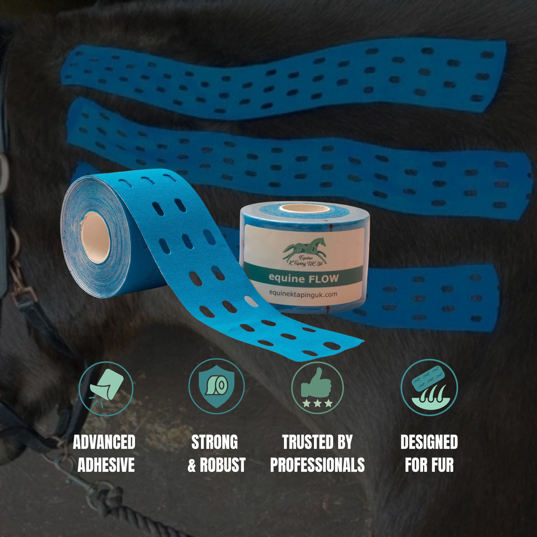 equine FLOW is an equine kinesiology tape new to the UK market with a unique cut holed pattern. Traditionally, equine therapists used various techniques’ which can be difficult to apply effectively on horses. equine FLOW is very easy to use and does all the work for you, also having the same superior adhesive ensuring that the application is long lasting.